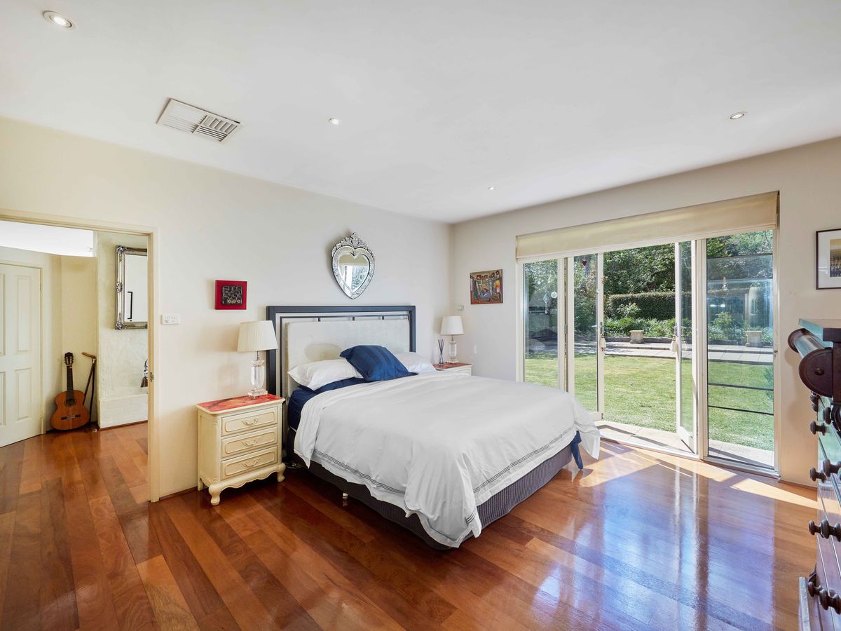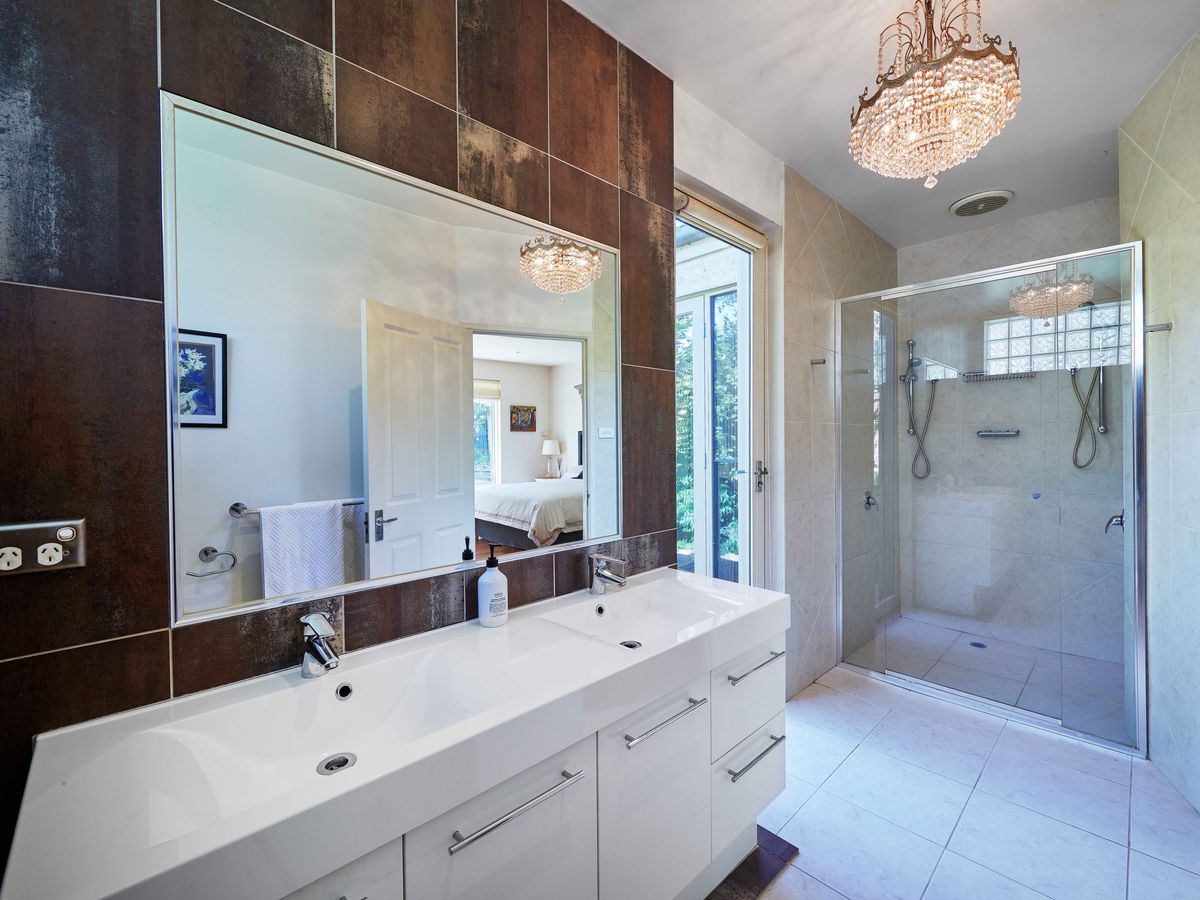 The home flows naturally from room to room, with French doors opening to leafy garden views and connecting indoor living to outdoor spaces. The layout balances comfort and functionality, offering four bedrooms, including a master with walk-in robe and sleek double-shower ensuite, plus two powder rooms and a central bathroom with spa.