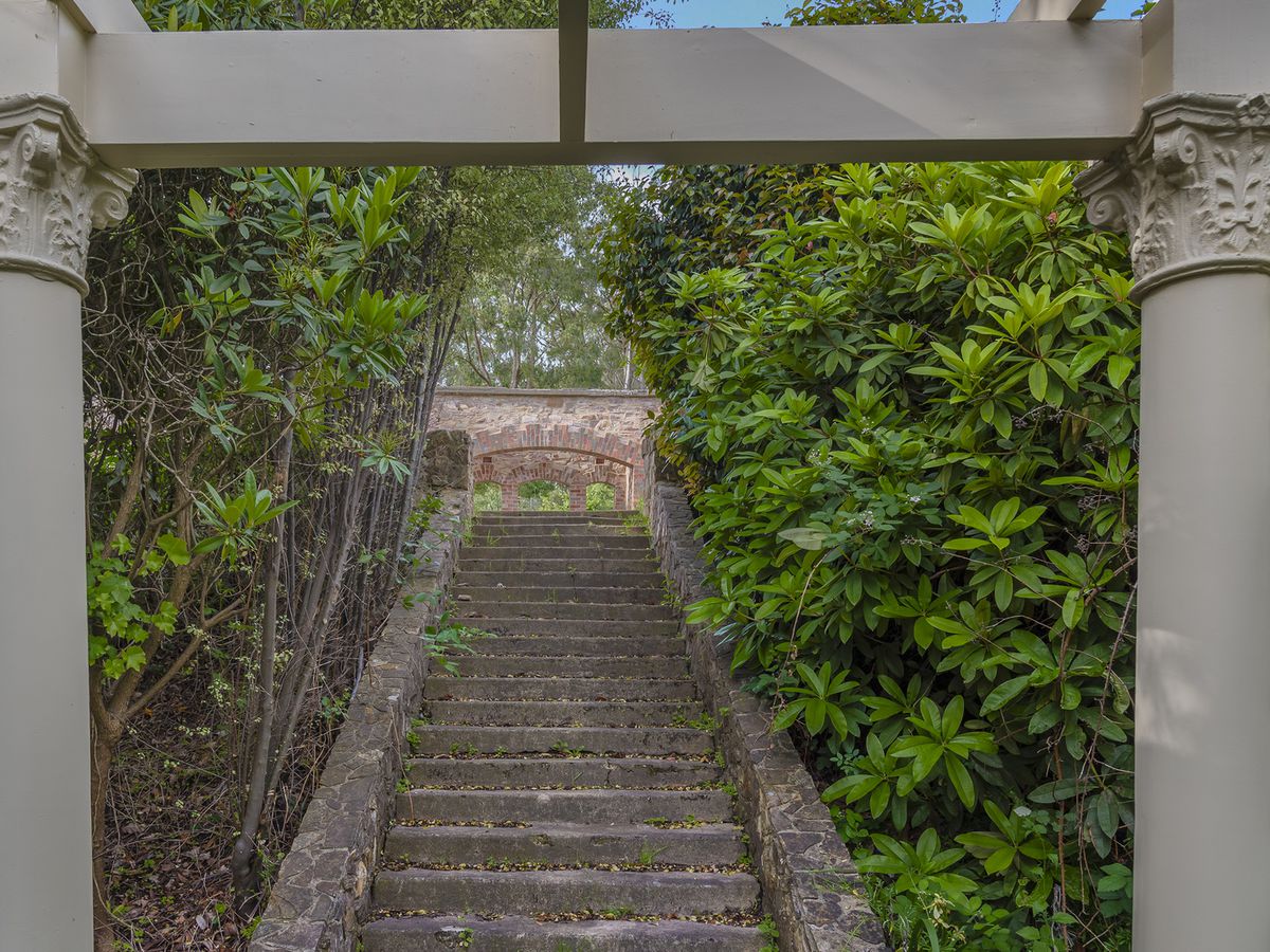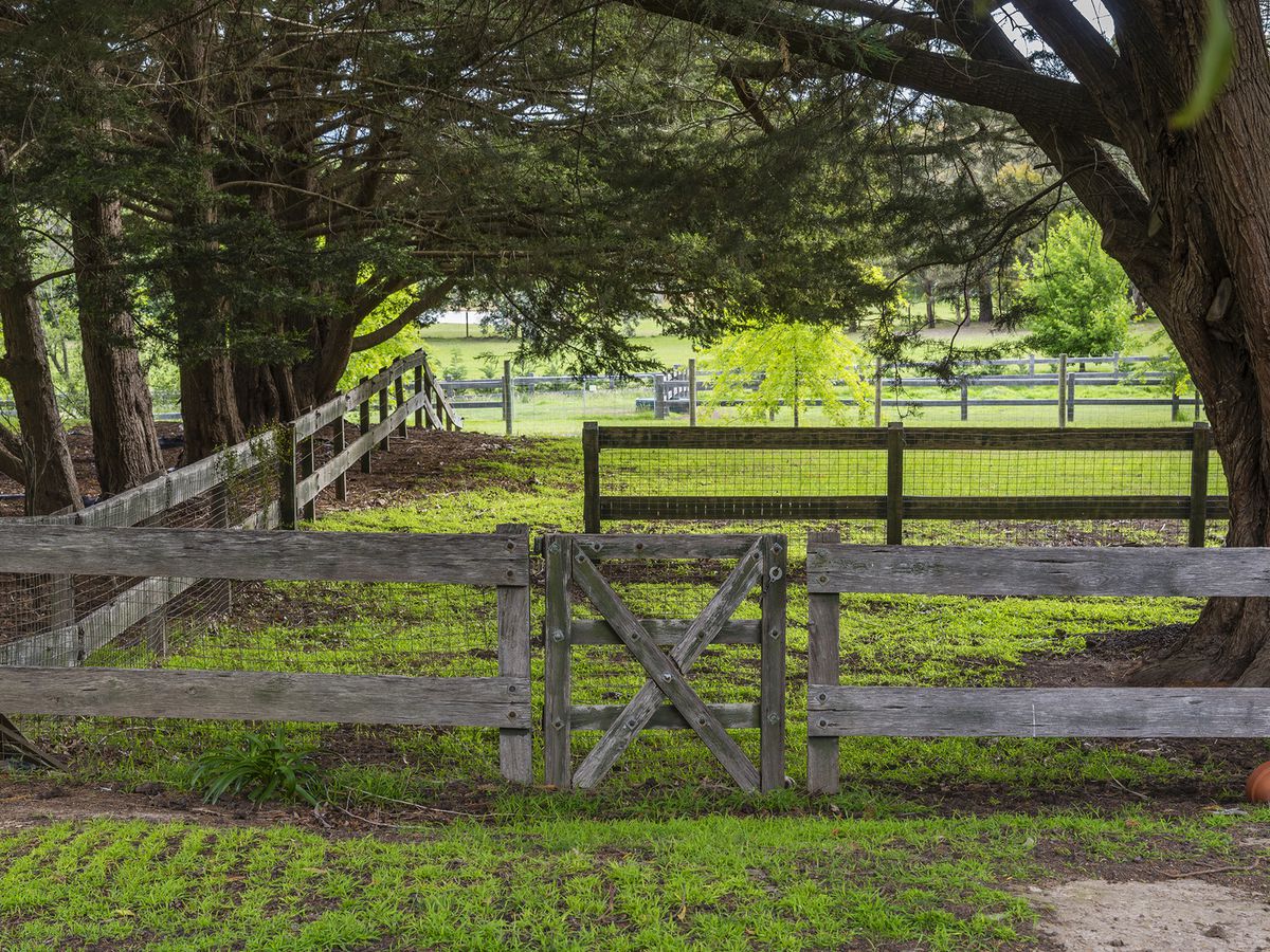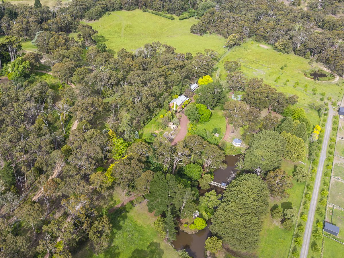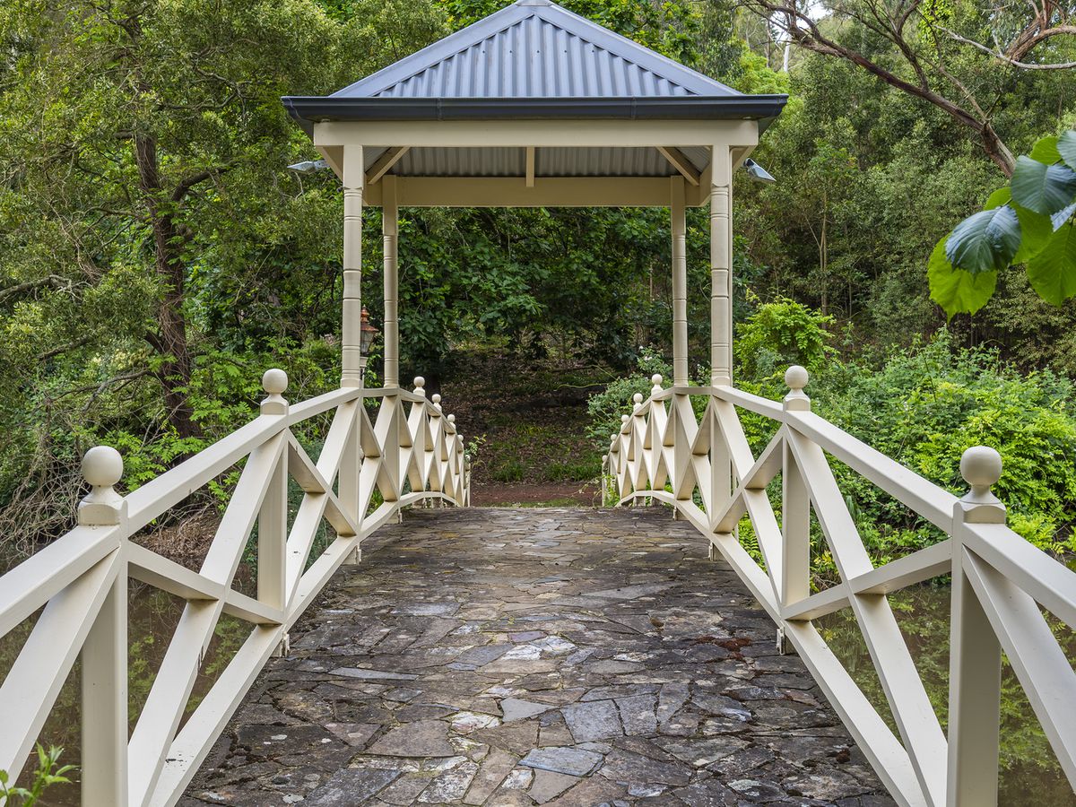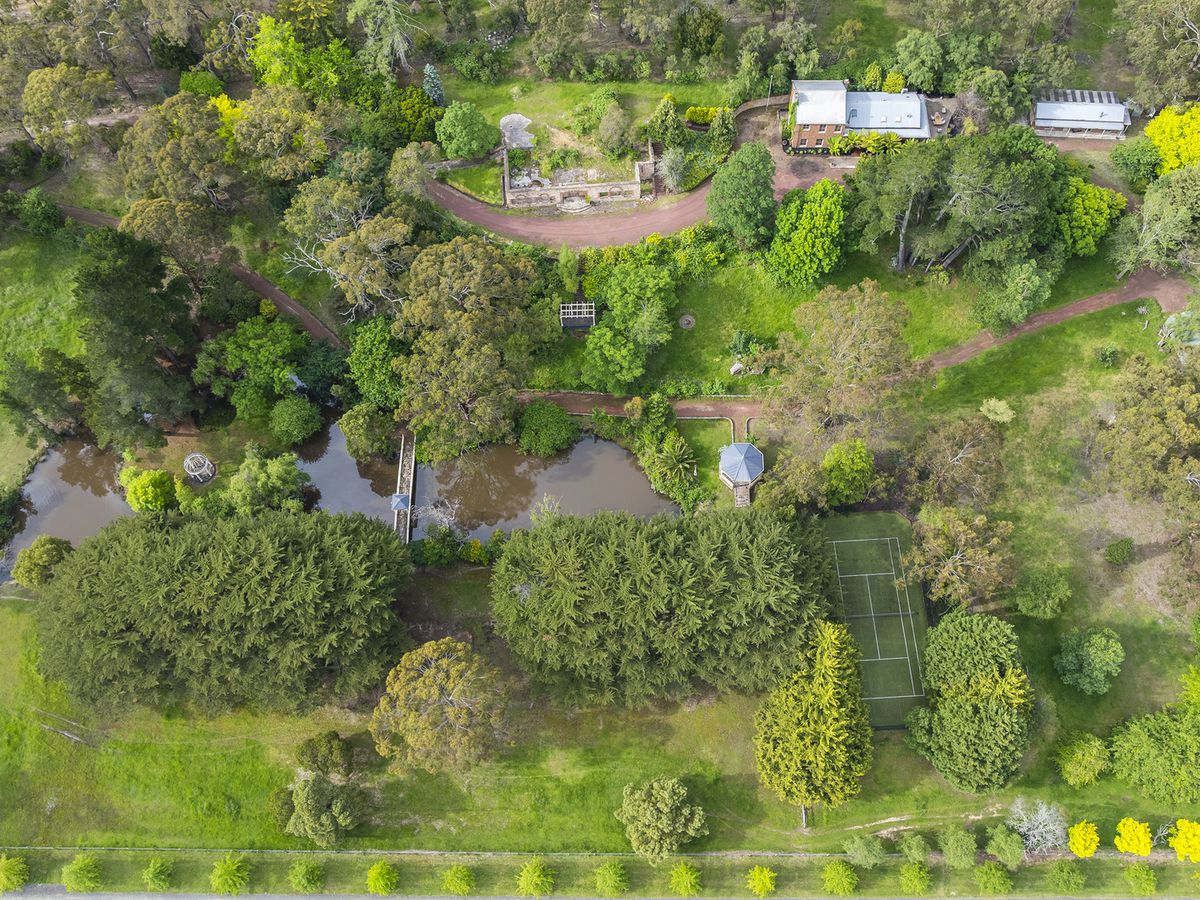 The 1985-built main home is surrounded by magnificent grounds featuring an ornamental lake with an island crowned by a garden temple, meandering paths, gazebos, dry-stone walls, and sweeping lawns framed by mature native and English trees, Rhododendrons, Camellias, and fern plantings. A full-size mod-grass tennis court sits near a grand Victorian-style gazebo, while the romantic stone ruins of an early 1900s lodge, constructed from rock quarried on-site, add a touch of historic charm and present an exciting opportunity to create an unforgettable outdoor entertaining precinct. The property also includes paddocks, a chicken coop, and a double garage.