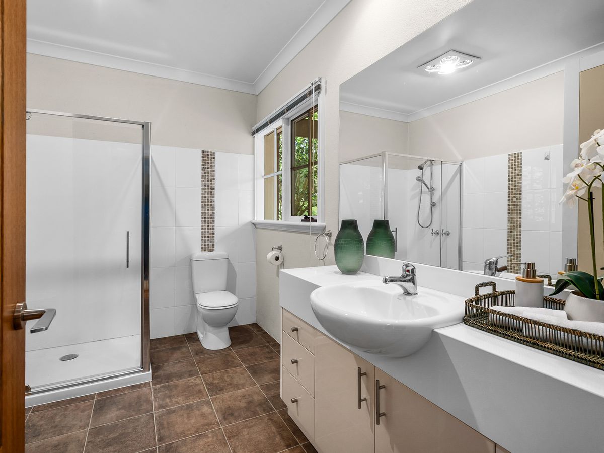 The substantial 27.5 sq residence delivers an elegant and functional layout, offering three large bedrooms and three bathrooms. Two upstairs bedrooms each feature built-in robes and private ensuites, while a third bedroom on the lower level is complemented by a versatile study area and main bathroom. The home includes two living areas, a formal dining space, a bar/kitchenette for entertaining, a modern kitchen with extensive storage, granite benchtops and a large stainless-steel electric oven, a laundry, and wide verandahs that frame the home beautifully.